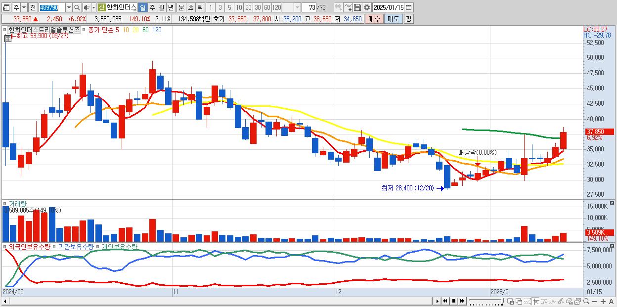- 한화인더스트리얼솔루션즈 (37,850원 ▲ 6.92% , 시총: 19,110억, 거래량: 3,589,085, 거래대금:1,346억)