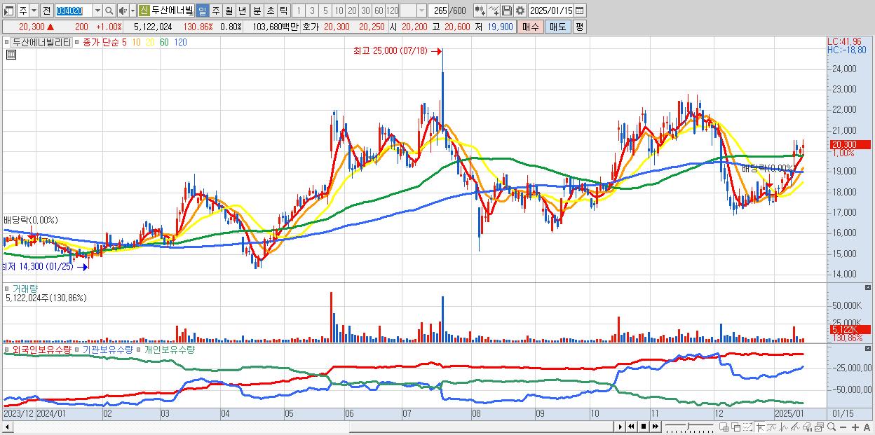- 두산에너빌리티 (20,300원 ▲ 1% , 시총: 130,034억, 거래량: 5,122,024, 거래대금:1,037억)