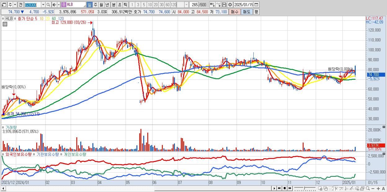 - HLB (74,700원 ▼ -5.92% , 시총: 98,146억, 거래량: 3,976,896, 거래대금:3,069억)
