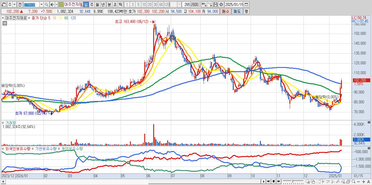- 대주전자재료 (102,200원 ▲ 7.58% , 시총: 15,821억, 거래량: 1,082,324, 거래대금:1,084억)