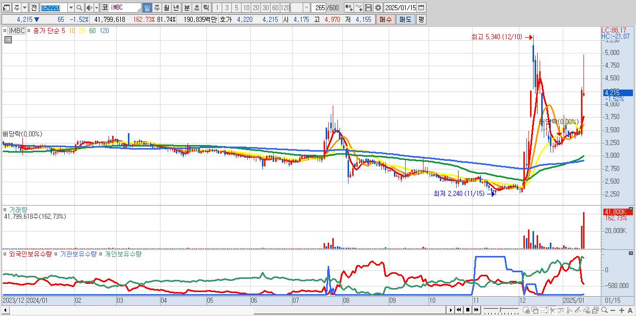 - iMBC (4,215원 ▼ -1.52% , 시총: 969억, 거래량: 41,799,618, 거래대금:1,908억)