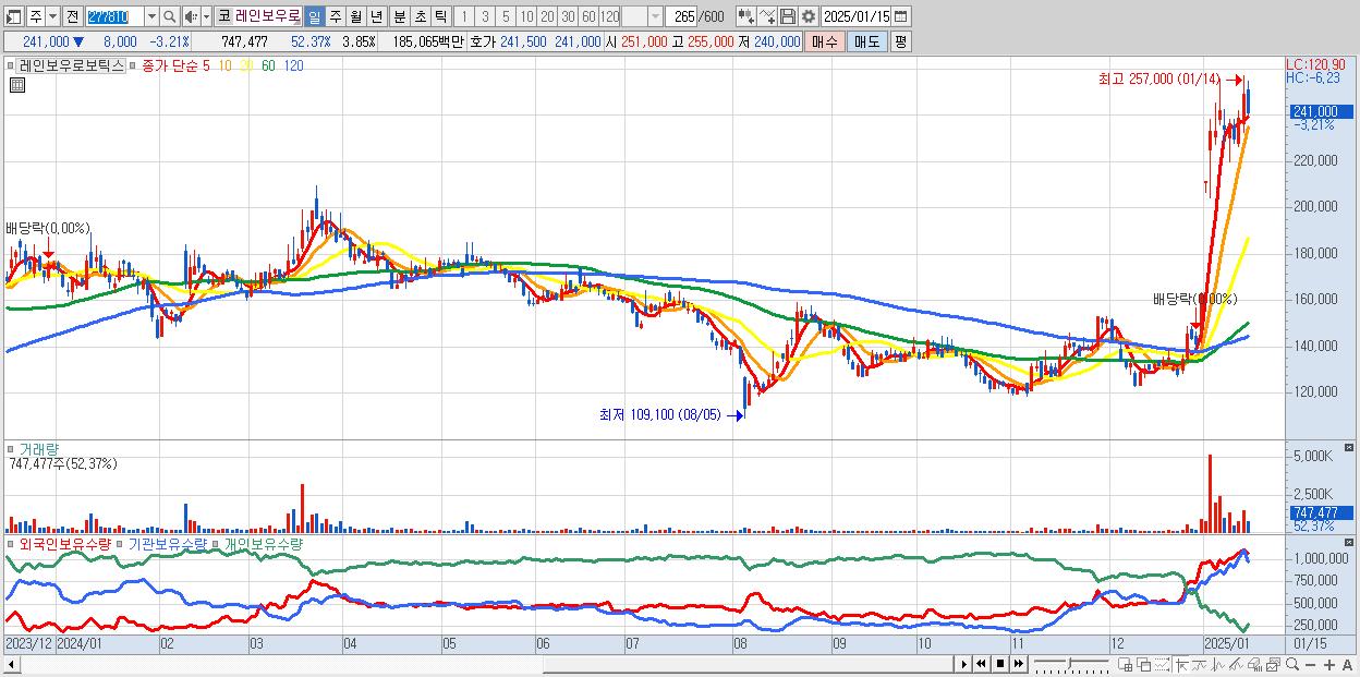 - 레인보우로보틱스 (241,000원 ▼ -3.21% , 시총: 46,754억, 거래량: 747,477, 거래대금:1,851억)
