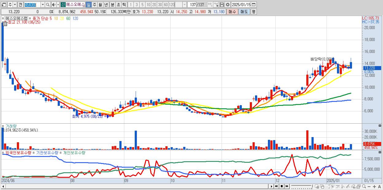- 에스오에스랩 (13,220원 0% , 시총: 2,338억, 거래량: 8,874,962, 거래대금:1,263억)