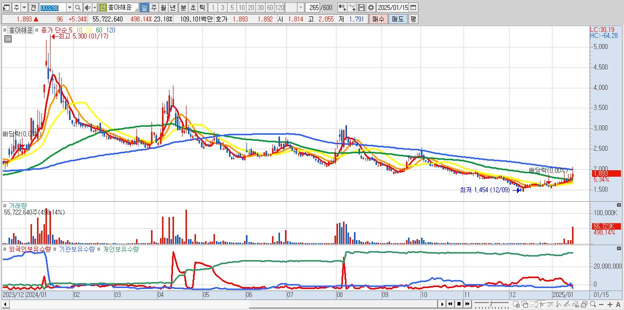- 흥아해운 (1,893원 ▲ 5.34% , 시총: 4,551억, 거래량: 55,722,640, 거래대금:1,091억)