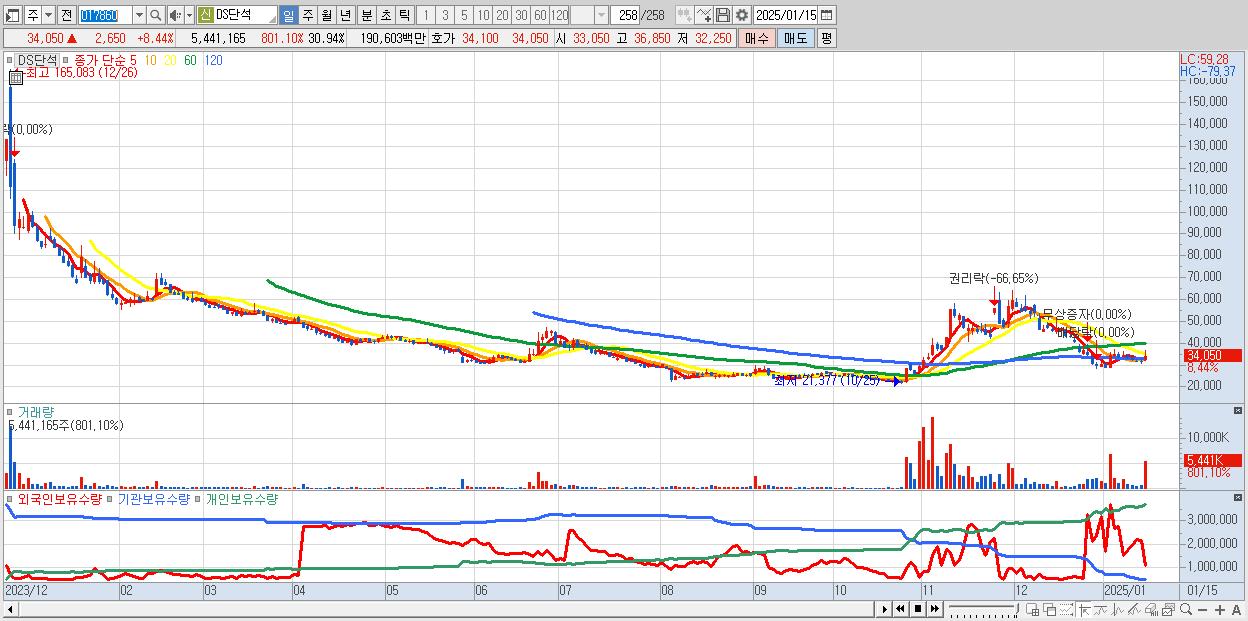 - DS단석 (34,050원 ▲ 8.44% , 시총: 5,987억, 거래량: 5,441,165, 거래대금:1,906억)