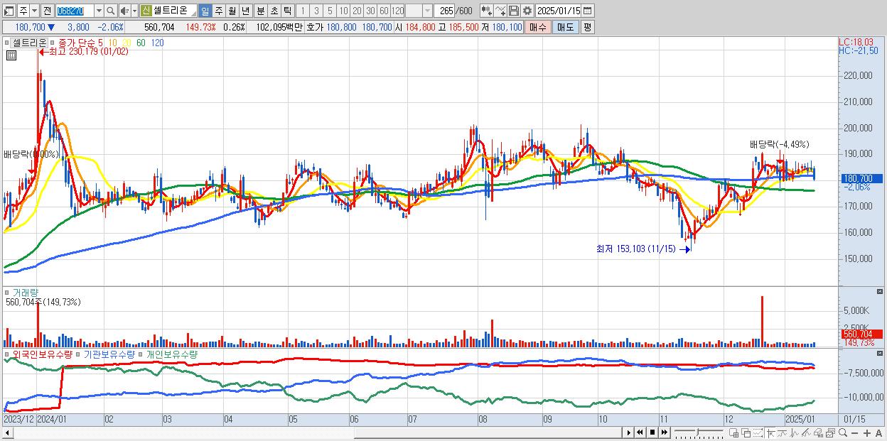 - 셀트리온 (180,700원 ▼ -2.06% , 시총: 392,261억, 거래량: 560,704, 거래대금:1,021억)