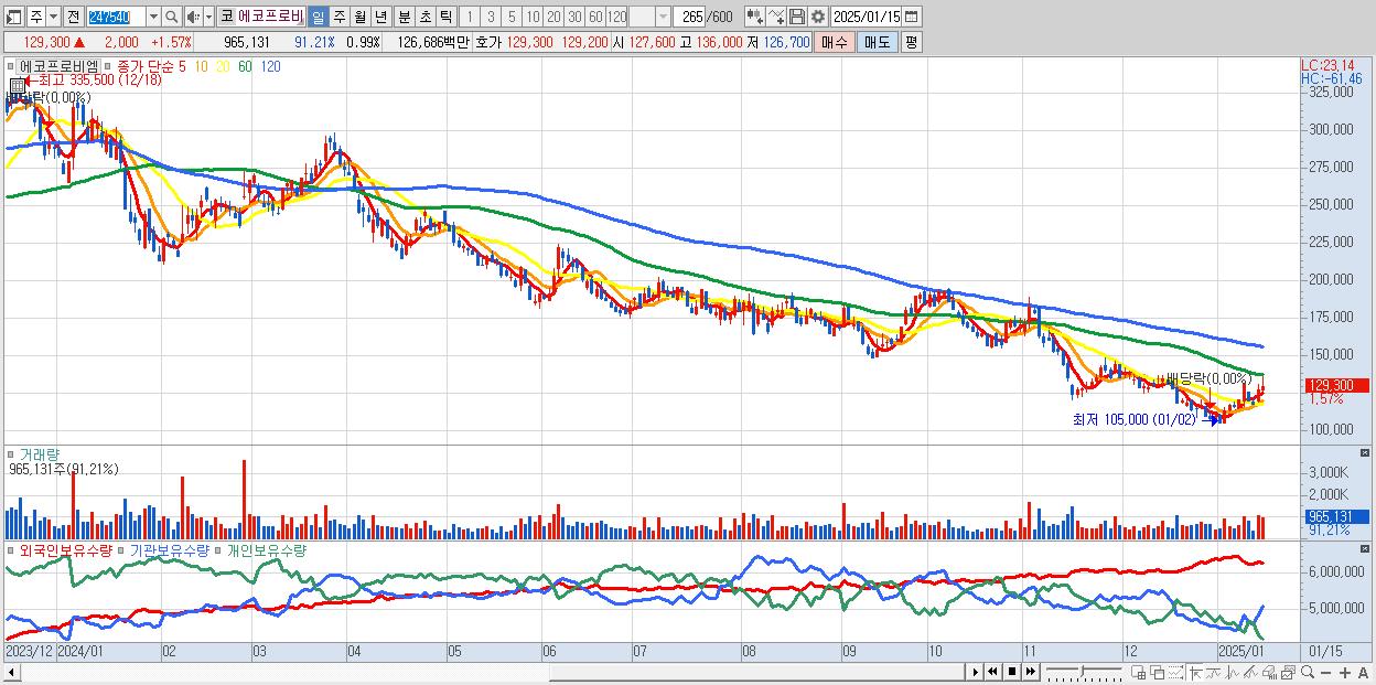 - 에코프로비엠 (129,300원 ▲ 1.57% , 시총: 126,457억, 거래량: 965,131, 거래대금:1,267억)