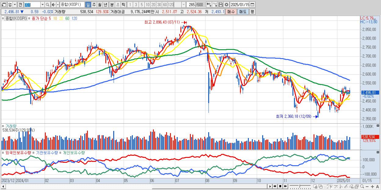 | 01/07 | 2,492.10 | ▲0.14% | -2,049억 | 1,587억 | -423억 | 885억 |