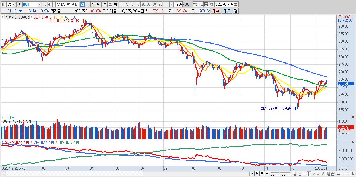 | 01/09 | 723.52 | ▲0.54% | 120억 | -213억 | 40억 | 53억 |