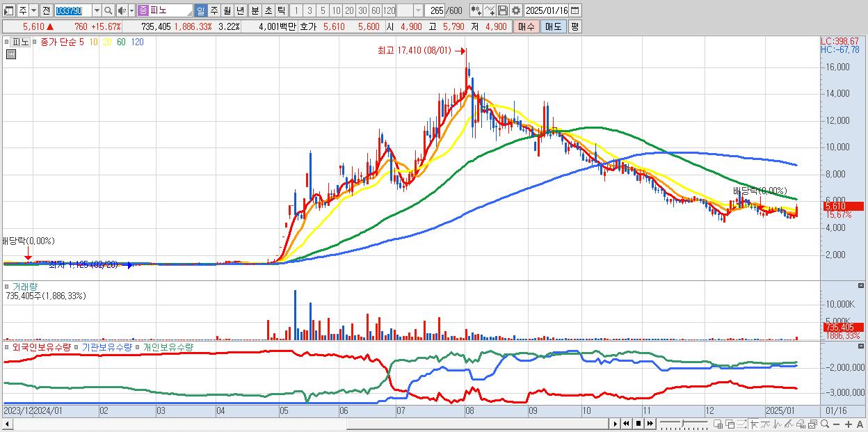 - 피노 (5,610원 ▲ 15.67% , 시총: 1,280억, 거래량: 735,405, 거래대금:40억)