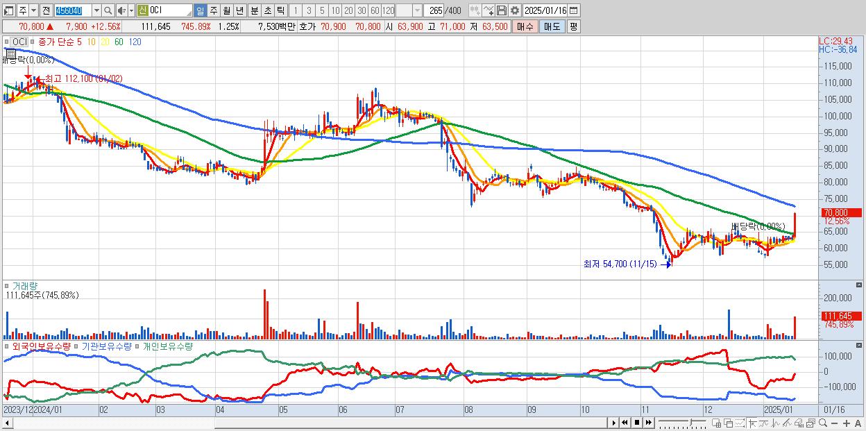 - OCI (70,800원 ▲ 12.56% , 시총: 6,338억, 거래량: 111,645, 거래대금:75억)