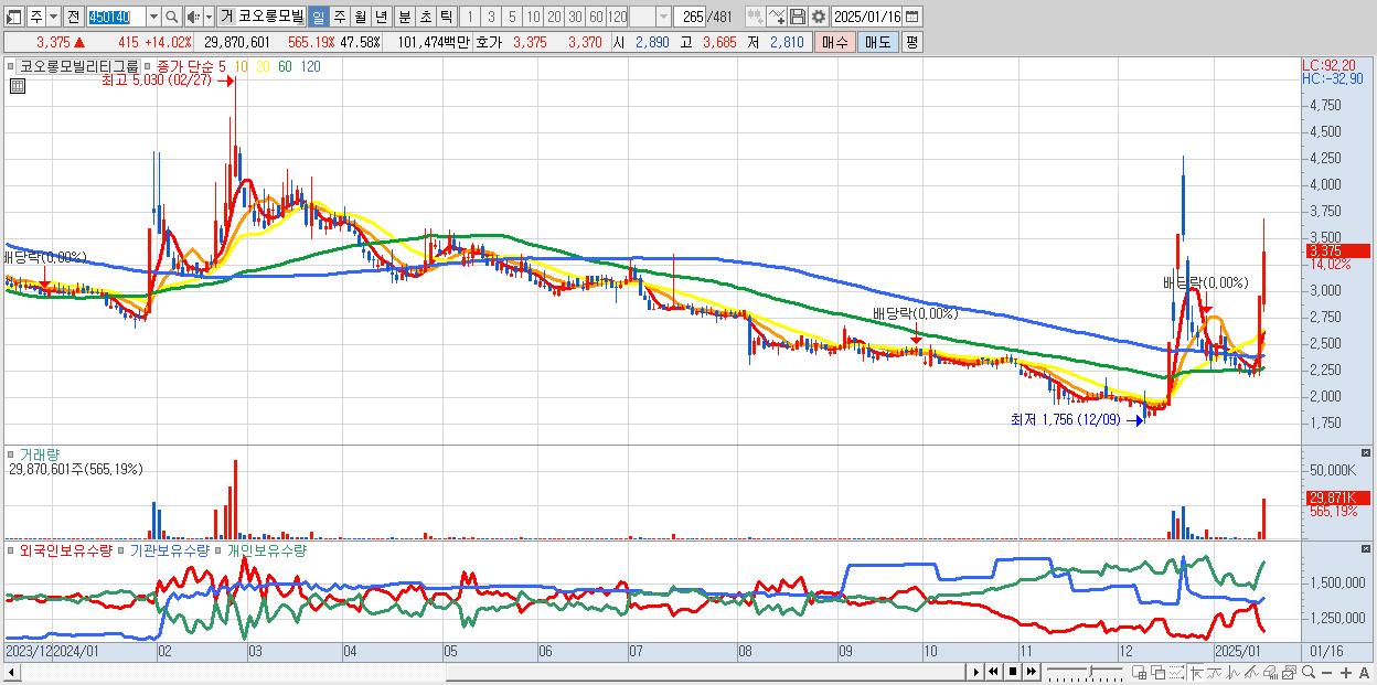 - 코오롱모빌리티그룹 (3,375원 ▲ 14.02% , 시총: 2,119억, 거래량: 29,870,601, 거래대금:1,015억)