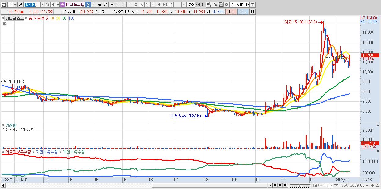 - 메디포스트 (11,700원 ▲ 11.43% , 시총: 4,003억, 거래량: 422,719, 거래대금:48억)