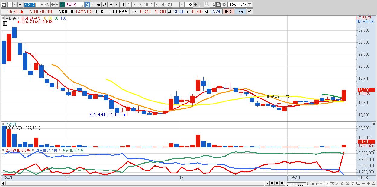 - 셀비온 (15,200원 ▲ 15.68% , 시총: 1,946억, 거래량: 2,130,016, 거래대금:310억)