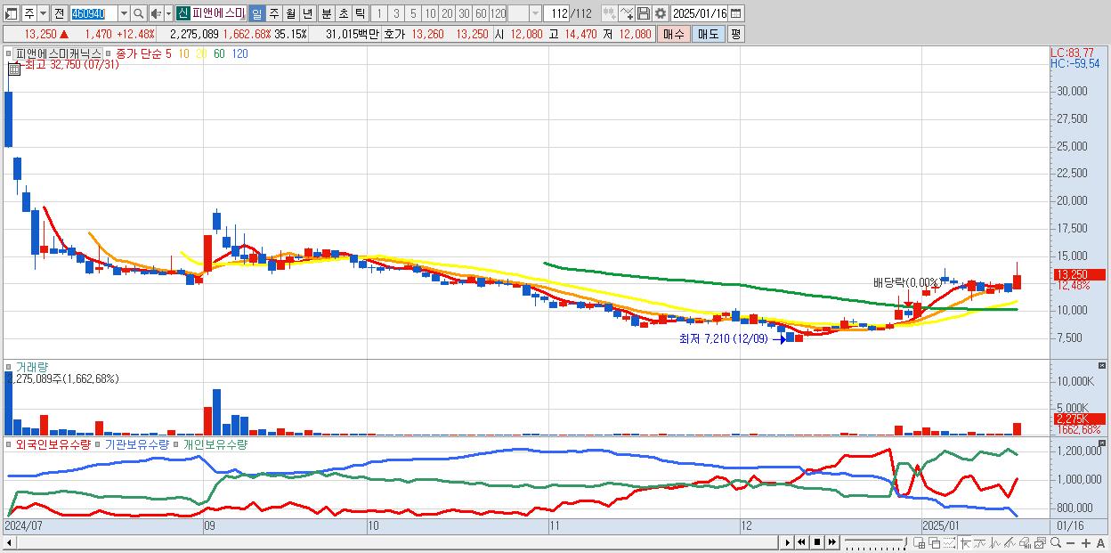 - 피앤에스미캐닉스 (13,250원 ▲ 12.48% , 시총: 858억, 거래량: 2,275,089, 거래대금:310억)
