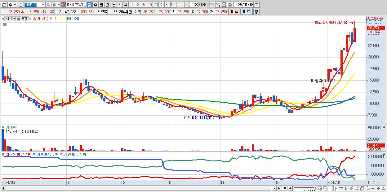 - 하이젠알앤엠 (26,250원 ▲ 14.13% , 시총: 8,108억, 거래량: 2,147,228, 거래대금:552억)