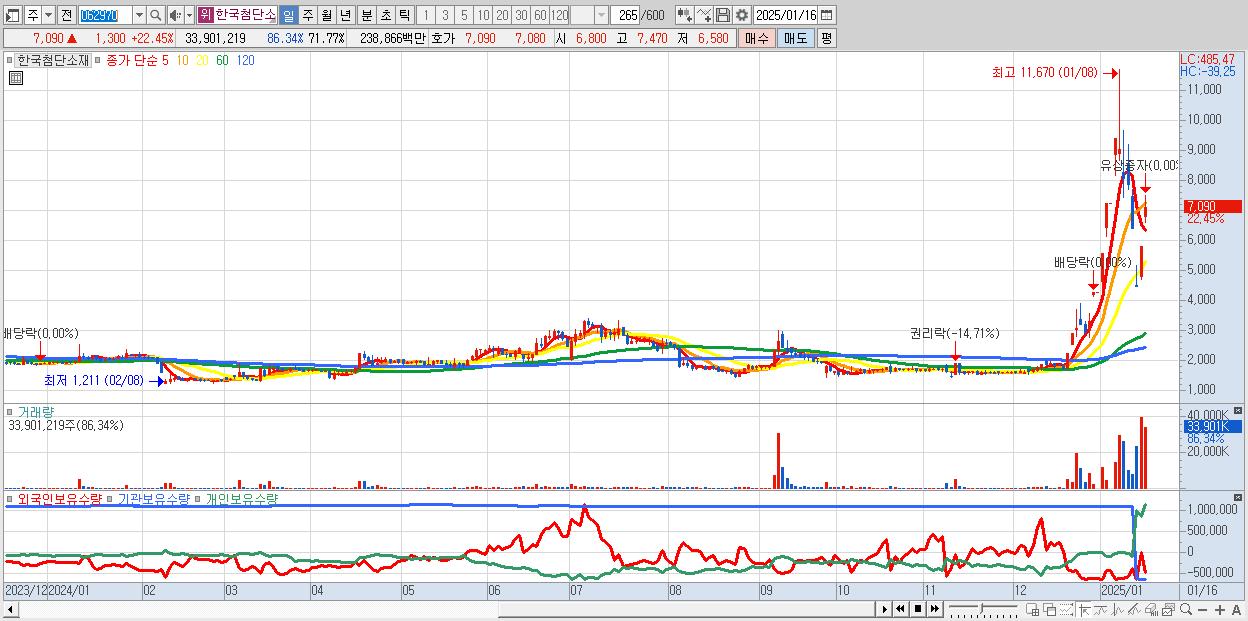 - 한국첨단소재 (7,090원 ▲ 22.45% , 시총: 1,399억, 거래량: 33,901,219, 거래대금:2,389억)