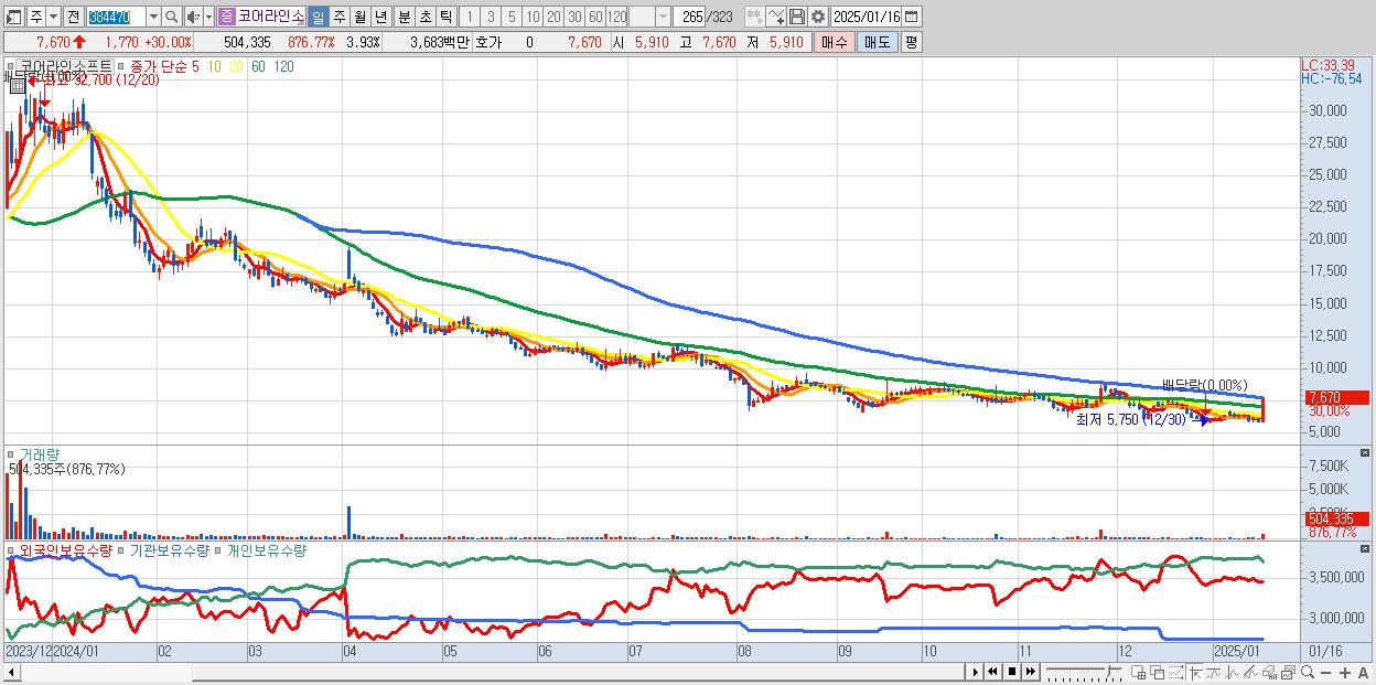 - 코어라인소프트 (7,670원 ▲ 30% , 시총: 984억, 거래량: 504,335, 거래대금:37억)