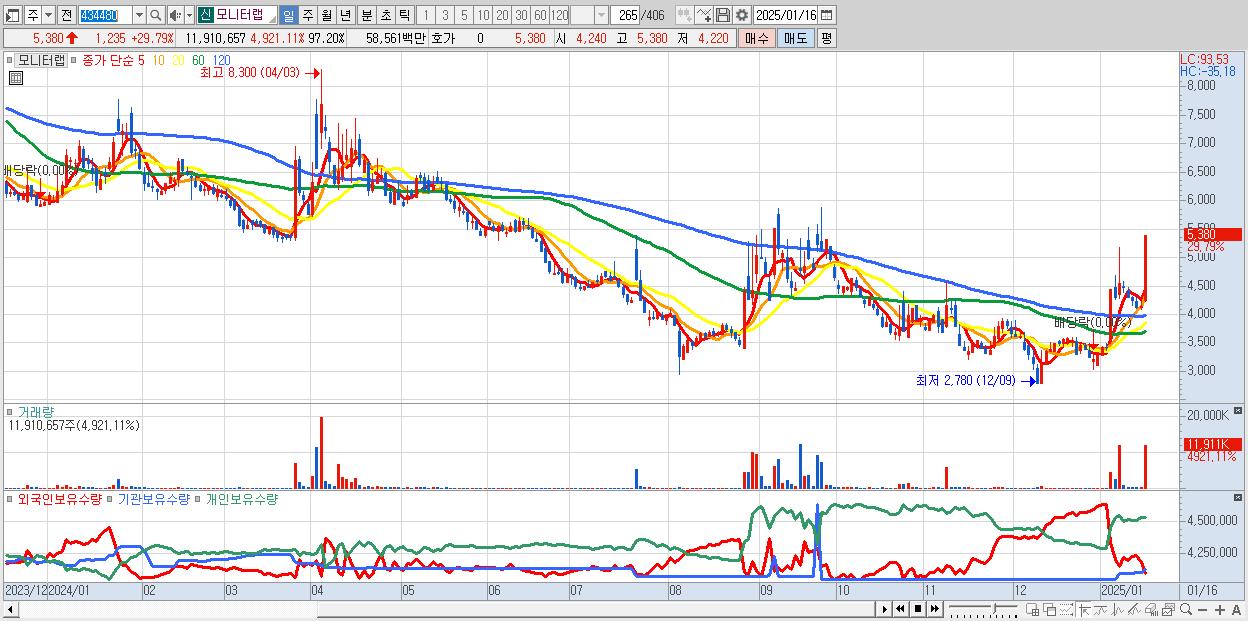 - 모니터랩 (5,380원 ▲ 29.79% , 시총: 659억, 거래량: 11,910,657, 거래대금:586억)