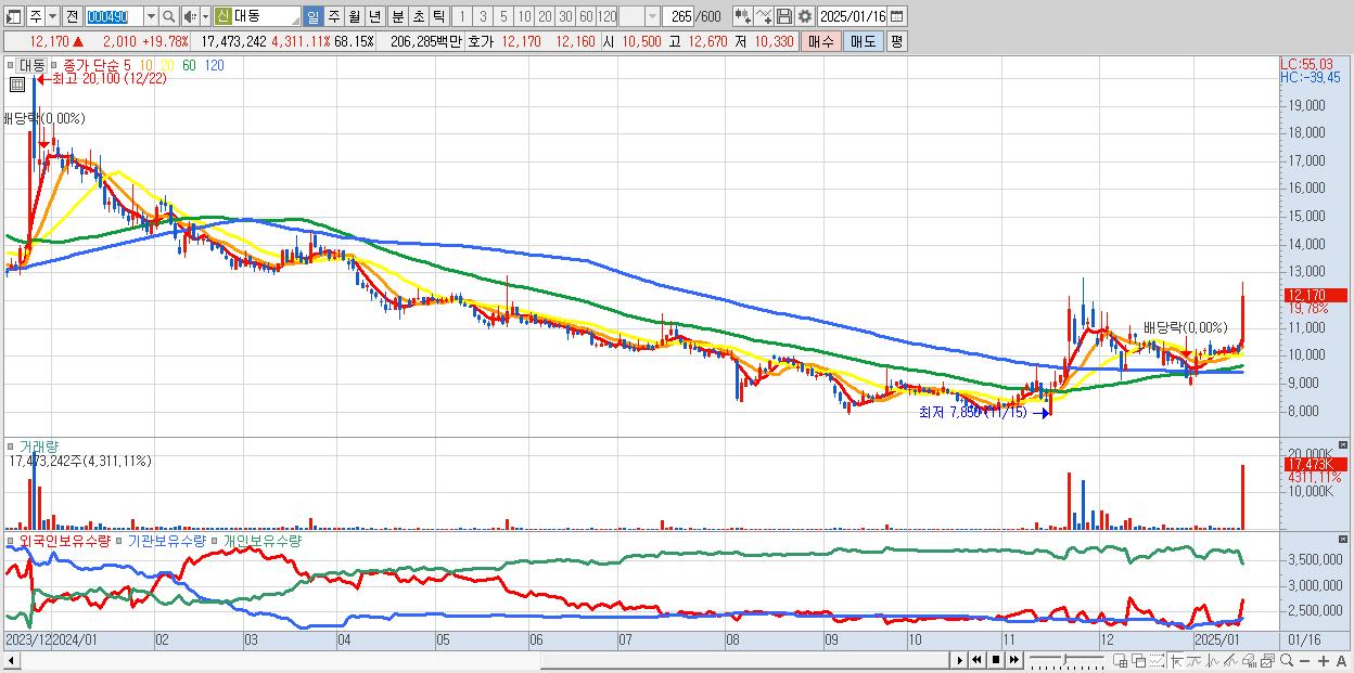 - 대동 (12,170원 ▲ 19.78% , 시총: 3,120억, 거래량: 17,473,242, 거래대금:2,063억)
