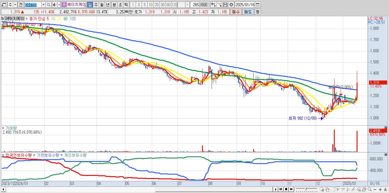 - 에이치케이 (1,319원 ▲ 11.4% , 시총: 244억, 거래량: 2,492,716, 거래대금:33억)