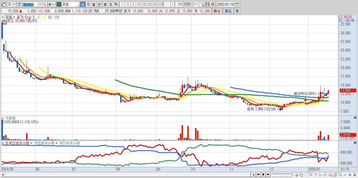 - 코칩 (13,500원 ▲ 12.03% , 시총: 1,148억, 거래량: 2,015,094, 거래대금:270억)