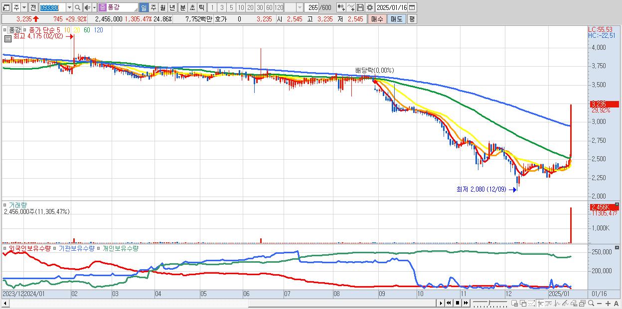 - 풍강 (3,235원 ▲ 29.92% , 시총: 320억, 거래량: 2,456,000, 거래대금:78억)