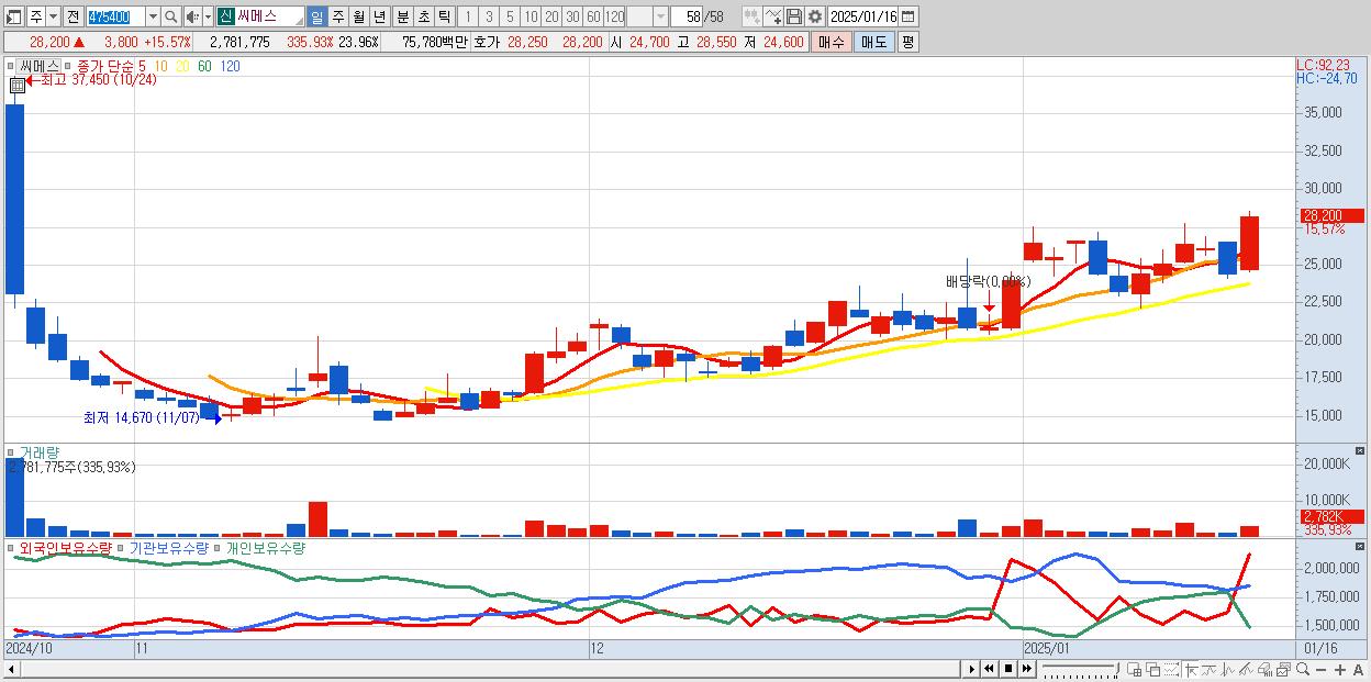 - 씨메스 (28,200원 ▲ 15.57% , 시총: 3,274억, 거래량: 2,781,775, 거래대금:758억)