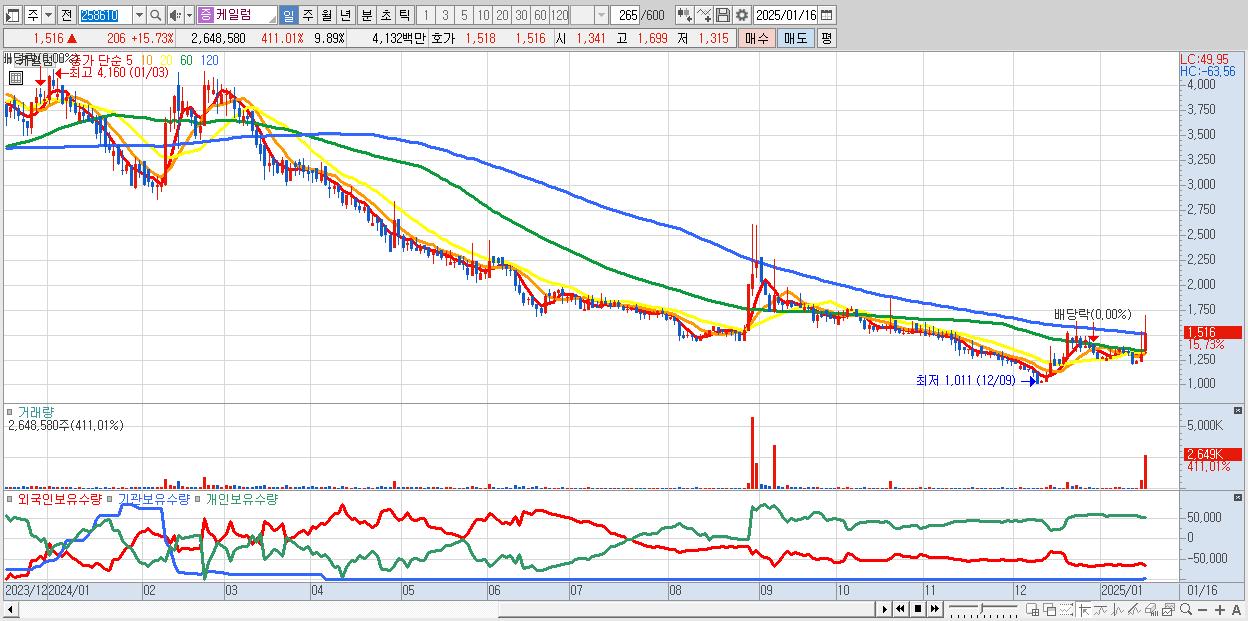 - 케일럼 (1,516원 ▲ 15.73% , 시총: 406억, 거래량: 2,648,580, 거래대금:41억)