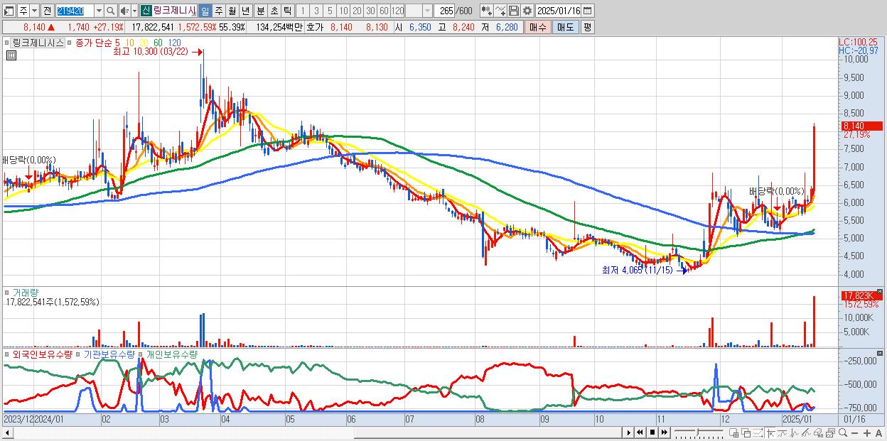 - 링크제니시스 (8,140원 ▲ 27.19% , 시총: 934억, 거래량: 17,822,541, 거래대금:1,343억)