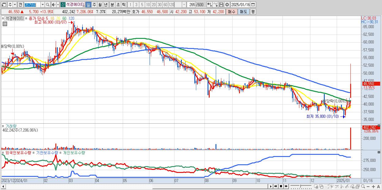 - 석경에이티 (46,550원 ▲ 13.95% , 시총: 2,539억, 거래량: 402,242, 거래대금:203억)