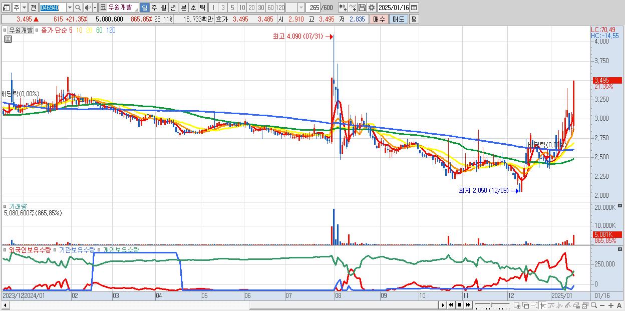 - 우원개발 (3,495원 ▲ 21.35% , 시총: 632억, 거래량: 5,080,600, 거래대금:167억)