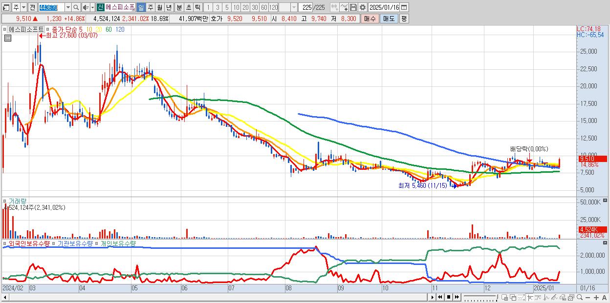 - 에스피소프트 (9,510원 ▲ 14.86% , 시총: 2,302억, 거래량: 4,524,124, 거래대금:419억)