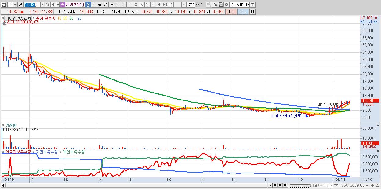 - 케이엔알시스템 (10,870원 ▲ 11.83% , 시총: 1,181억, 거래량: 1,117,795, 거래대금:117억)