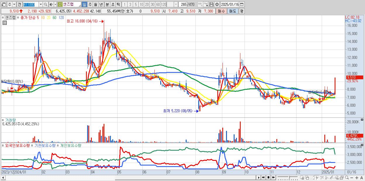 2.샌즈랩 9,510원 ▲ 29.92% (KOSDAQ, 411080)