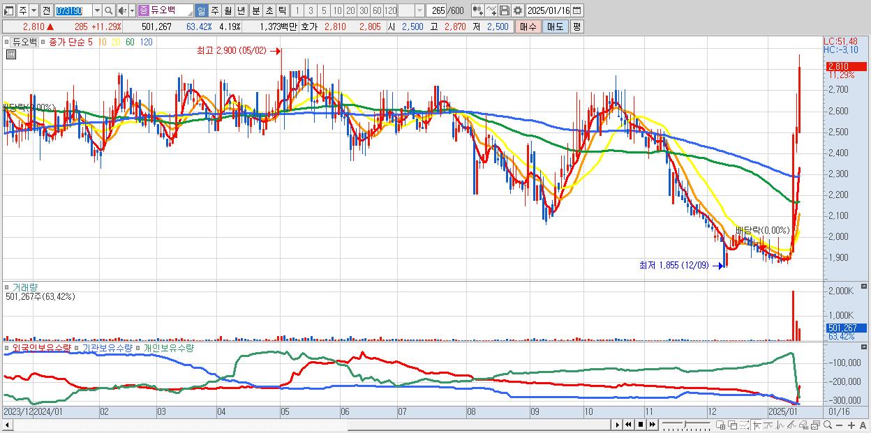 - 듀오백 (2,810원 ▲ 11.29% , 시총: 336억, 거래량: 501,267, 거래대금:14억)