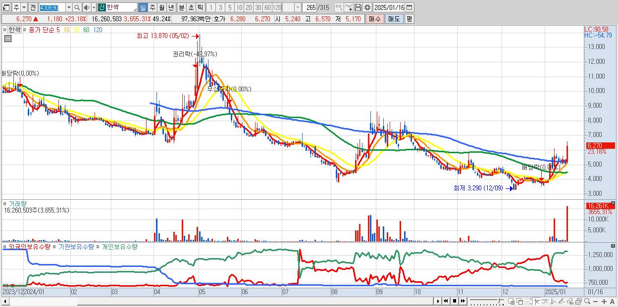 - 한싹 (6,270원 ▲ 23.18% , 시총: 683억, 거래량: 16,260,503, 거래대금:980억)