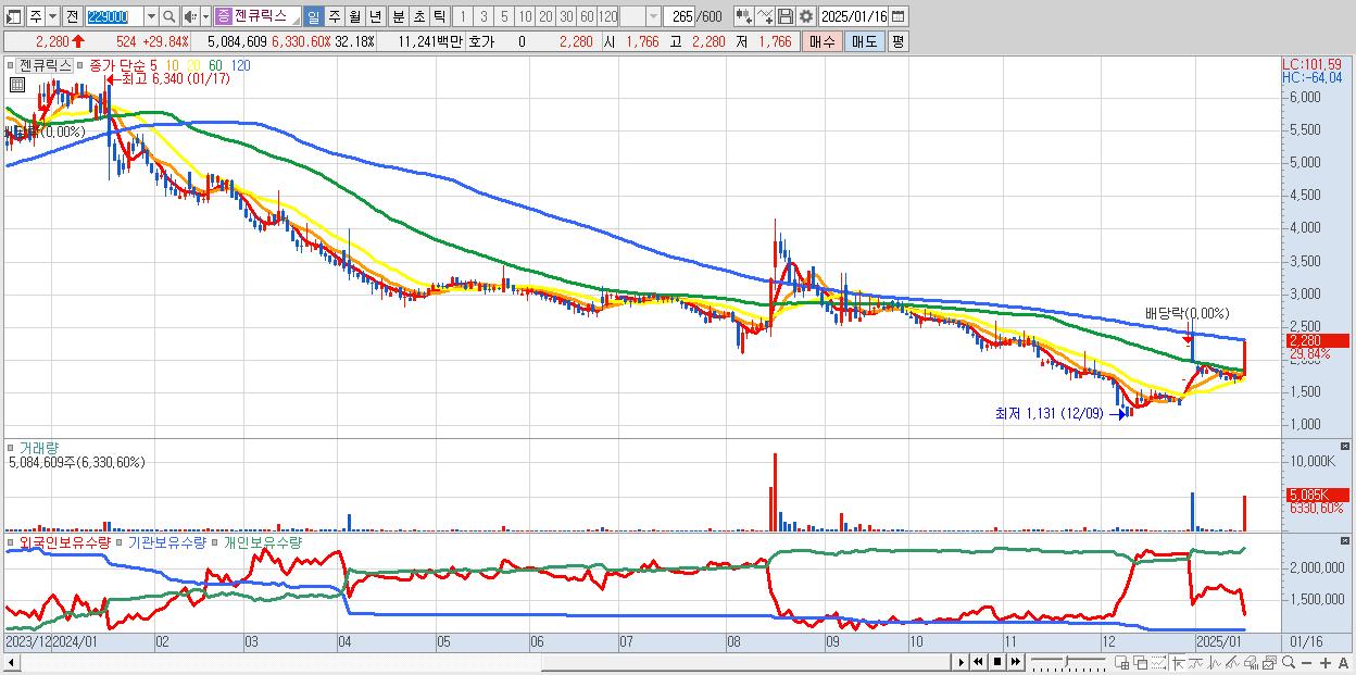 - 젠큐릭스 (2,280원 ▲ 29.84% , 시총: 360억, 거래량: 5,084,609, 거래대금:112억)