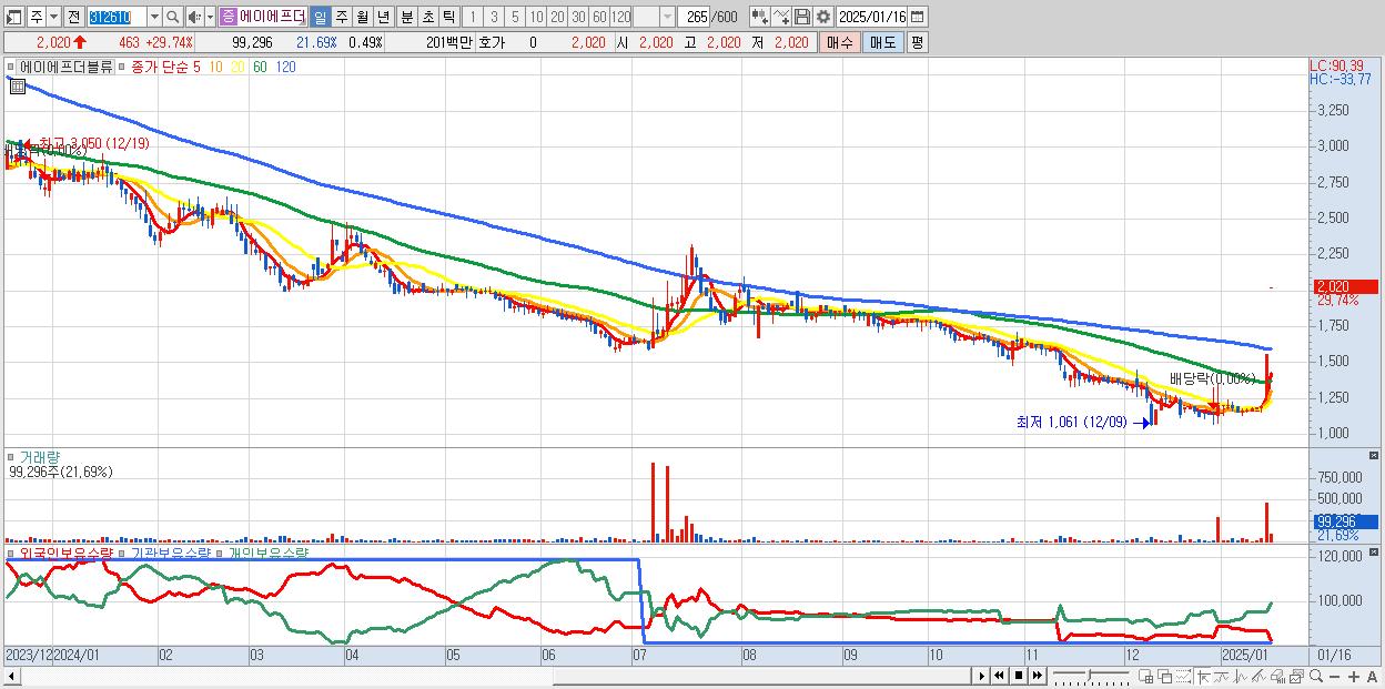 - 에이에프더블류 (2,020원 ▲ 29.74% , 시총: 409억, 거래량: 99,296, 거래대금:2억)