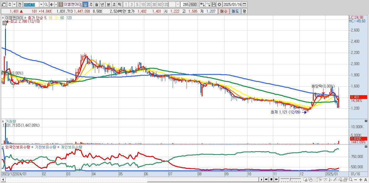 - 이엠앤아이 (1,401원 ▲ 14.84% , 시총: 299억, 거래량: 1,831,713, 거래대금:25억)
