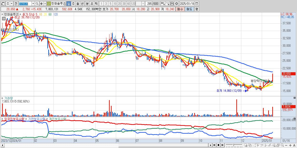 - 한화솔루션 (20,650원 ▲ 15.43% , 시총: 35,496억, 거래량: 7,803,131, 거래대금:1,523억)