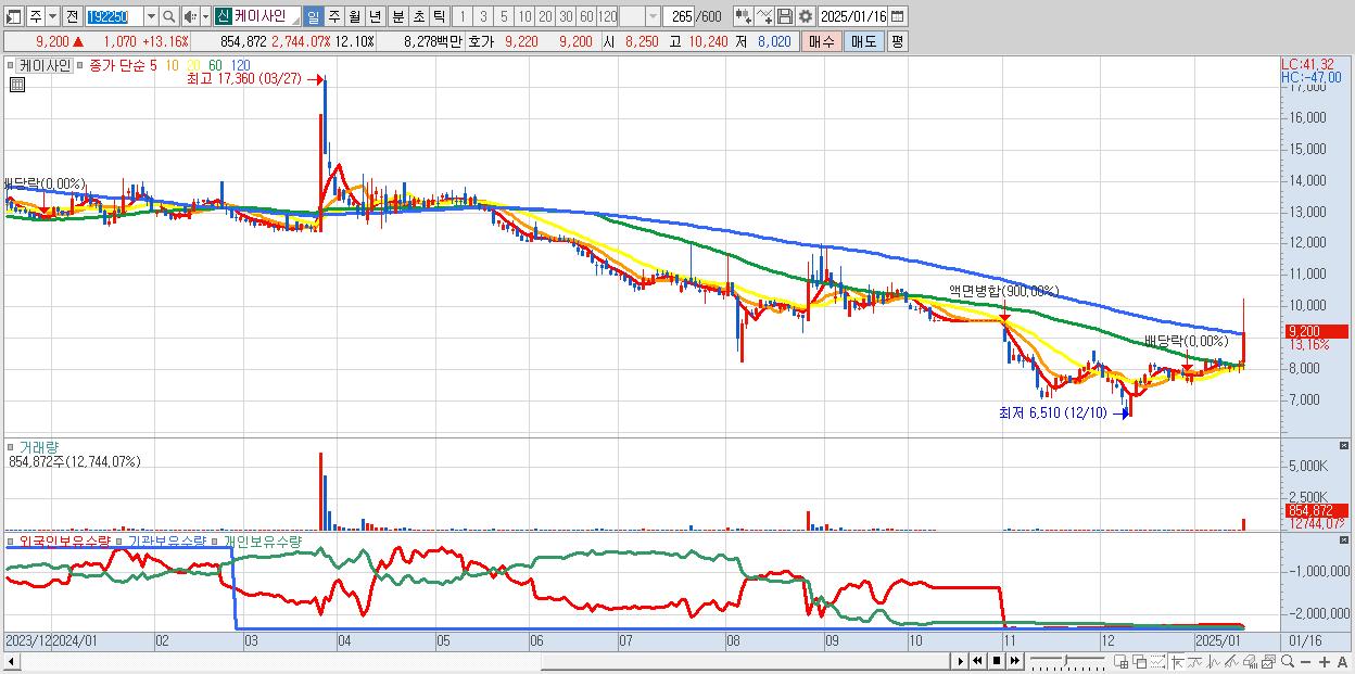 - 케이사인 (9,200원 ▲ 13.16% , 시총: 650억, 거래량: 854,872, 거래대금:83억)