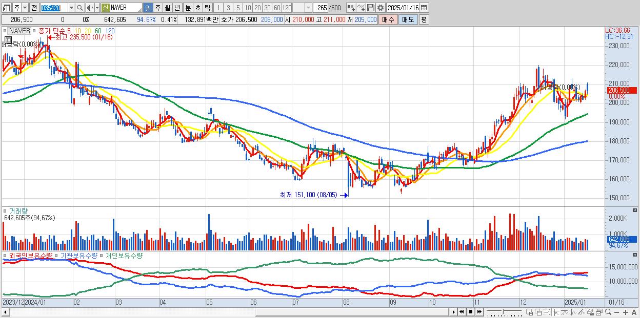 - NAVER (206,500원 0% , 시총: 327,172억, 거래량: 642,605, 거래대금:1,329억)