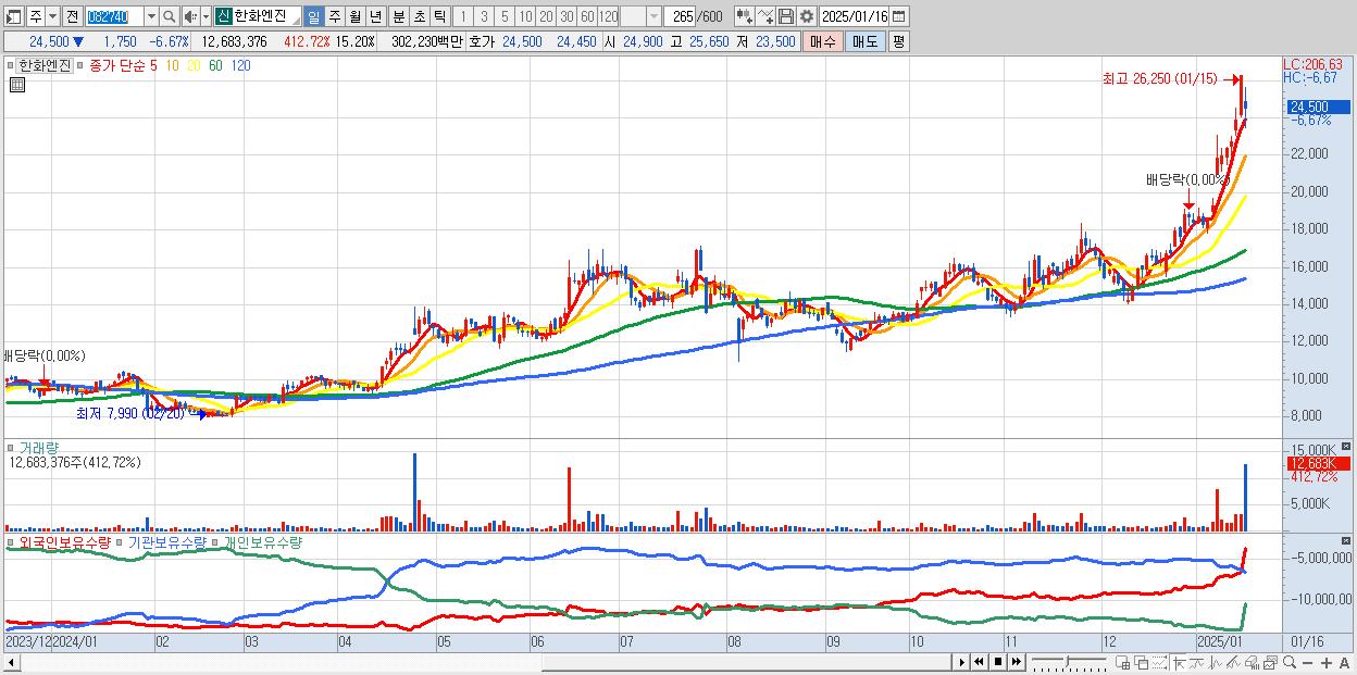 - 한화엔진 (24,500원 ▼ -6.67% , 시총: 20,445억, 거래량: 12,683,376, 거래대금:3,022억)