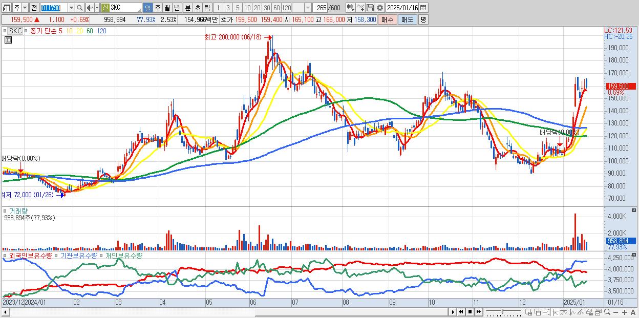 - SKC (159,500원 ▲ 0.69% , 시총: 60,400억, 거래량: 958,894, 거래대금:1,550억)