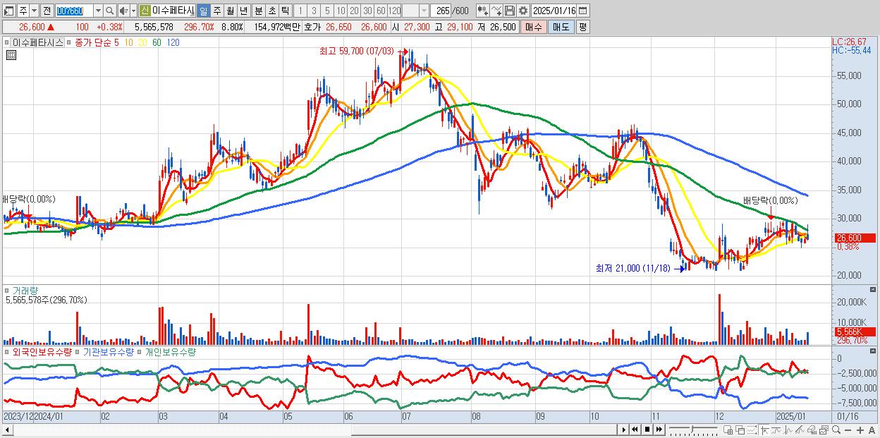 - 이수페타시스 (26,600원 ▲ 0.38% , 시총: 16,824억, 거래량: 5,565,578, 거래대금:1,550억)