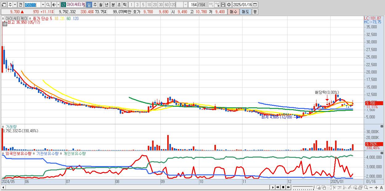 - 아이씨티케이 (9,700원 ▲ 11.11% , 시총: 1,288억, 거래량: 9,792,332, 거래대금:991억)