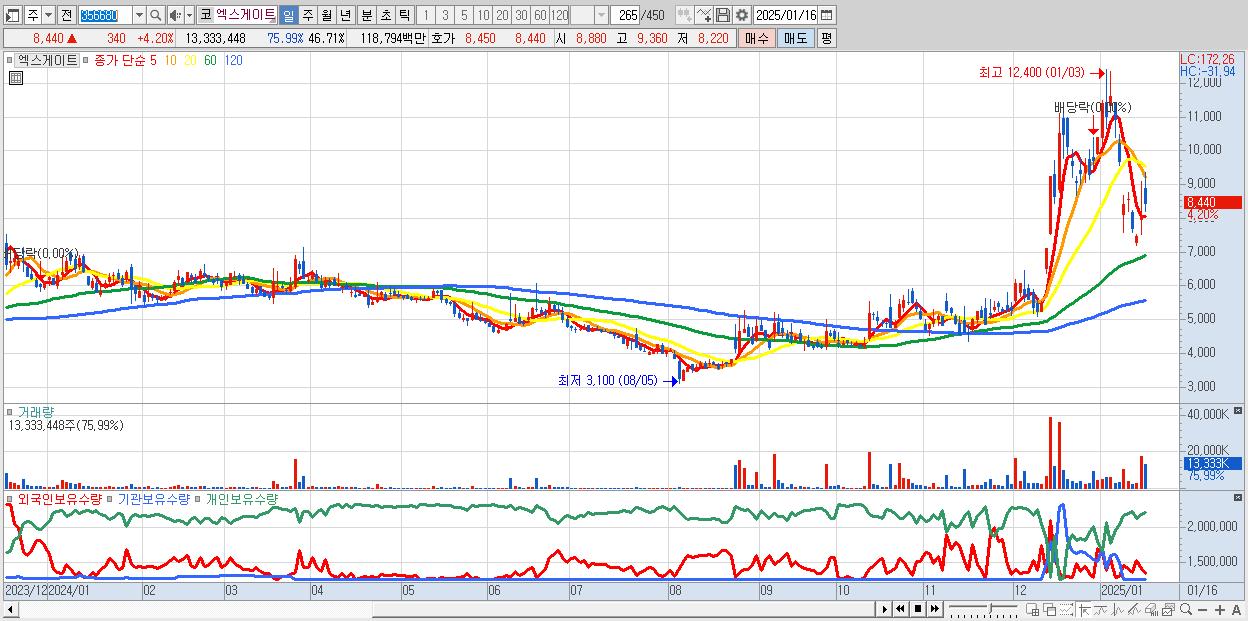 - 엑스게이트 (8,440원 ▲ 4.2% , 시총: 2,409억, 거래량: 13,333,448, 거래대금:1,188억)