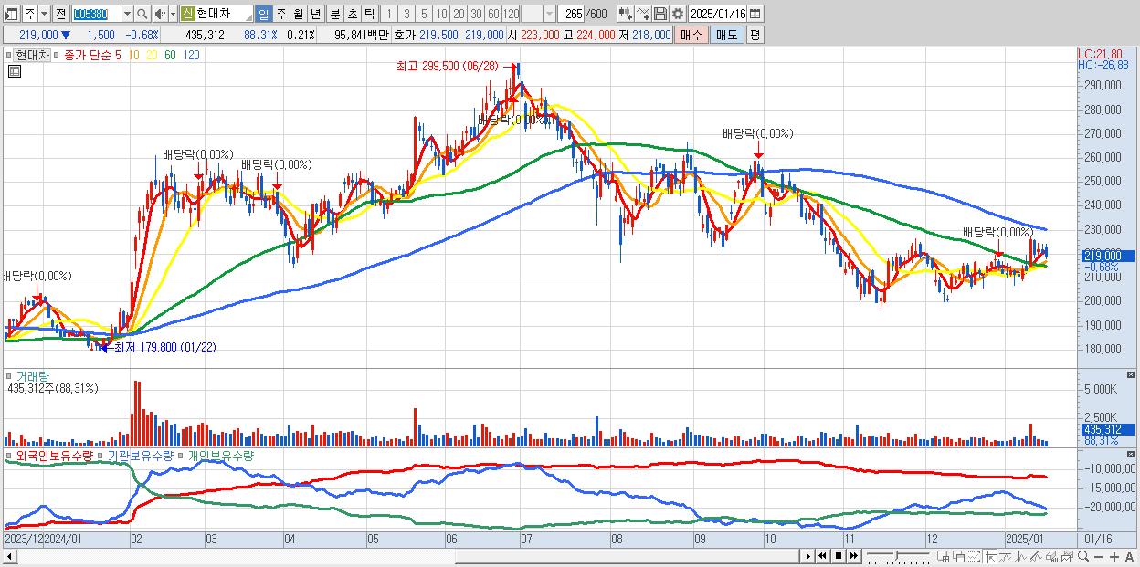 - 현대차 (219,000원 ▼ -0.68% , 시총: 458,621억, 거래량: 435,312, 거래대금:958억)