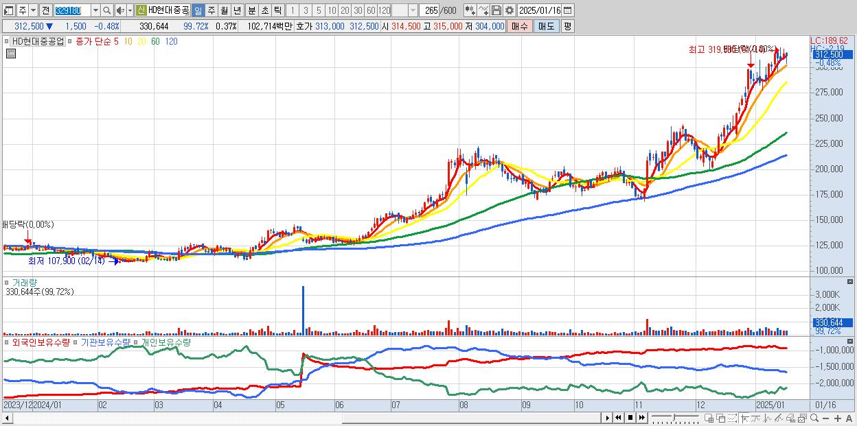 - HD현대중공업 (312,500원 ▼ -0.48% , 시총: 277,416억, 거래량: 330,644, 거래대금:1,027억)